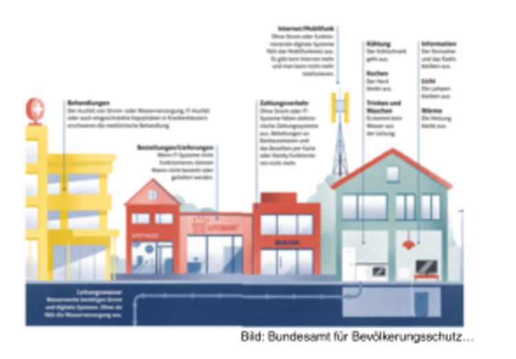 Unser Alltag kann aus vielen Gründen unterbrochen werden. Ein Unfall, Extremwetter oder Sabotage können die Leitungen für Strom, Wasser, Gas oder Mobilfunk beschädigen. Cyberangriffe können die IT-Systeme stören, die wir im Alltag brauchen, zum Beispiel in Krankenhäusern, Versorgungswerken oder Supermärkten. Einzelne Störungen können gleichzeitig unterschiedliche Auswirkungen haben und viele Menschen betreffen. Es kann dauern, bis alle Betroffenen Hilfe erhalten. In diesen Situationen entlastet Vorsorge.